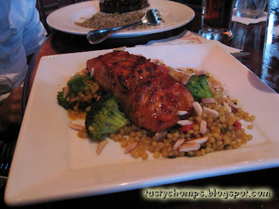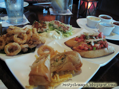 We start the meal off with the small plate sampler($14.95), a sampling of their popular appetizers: Calamari, Spring Rolls, Crabcake & Toasted Bruschetta accompanied by four sauces. The calamari was tender and tasty and served with a thai chili sauce. The spring rolls were a mix of chicken, Napa cabbage, garlic, soy and ginger. The bruschetta came with marinated tomatoes with capers, black pepper, basil pesto and shaved Reggiano Parmesan cheese. The crabcake was made of lump crab meat, house made tartar sauce, mixed greens, tossed in Miso dressing. The appetizers were all to our liking and were a great way to begin the meal.