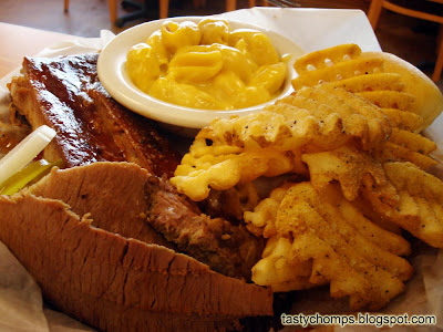 You order your meal first at the counter, priced by the number of meats or cheaper if you get a sandwich.I ordered the two meats platter: sweet pork ribs and pulled pork with baked bbq beans and waffle fries for my sides. A few of my friends got the beef brisket and pulled pork with macaroni and cheese and waffle fries for their sides. They also serve spicy polish sausage, smoked chicken breast, and smoked turkey breast for meats and baked potato casserole (kind of like mashed potatoes) among others for their sides.