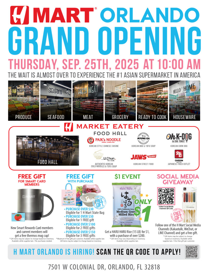 H Mart, the largest Asian supermarket chain in the United States, .is set to open a brand-new, 100,074-square-foot store located at 7501 W Colonial Dr, Orlando, FL, on September 25, 2025, at 10 a.m.