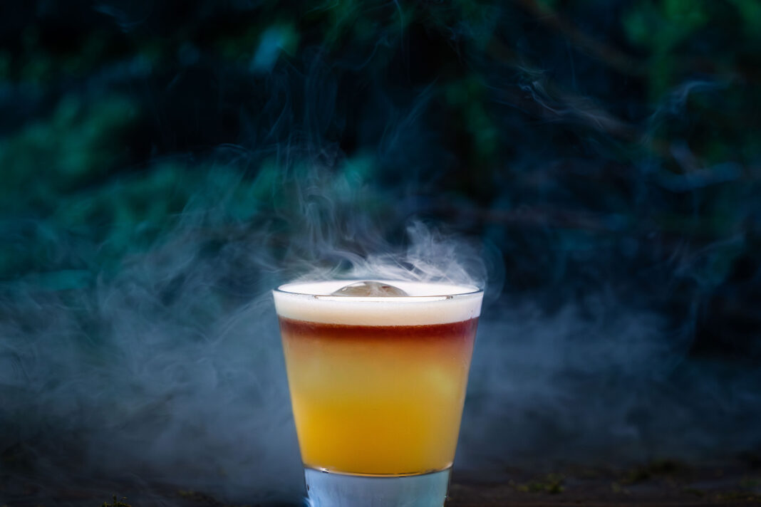 | 1.5 oz Bourbon .5 oz Liqueur 1.25 oz Peach Puree .75 oz Lemon Juice 3 Dash Foam .5 oz Pinot Noir Float Utilizing Flavor Blaster smoke for a fog effect | |