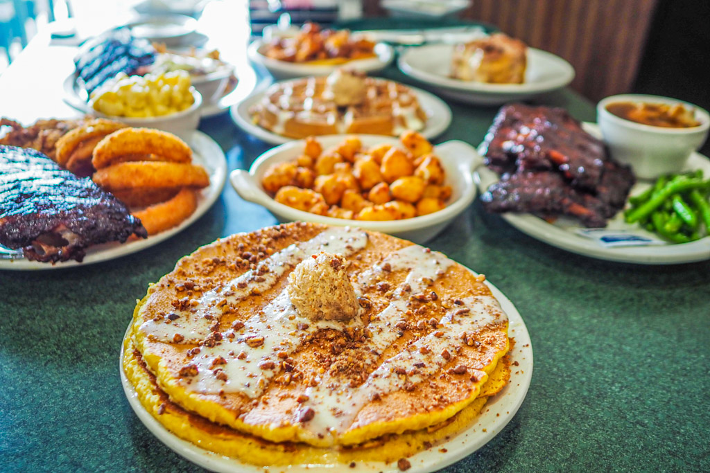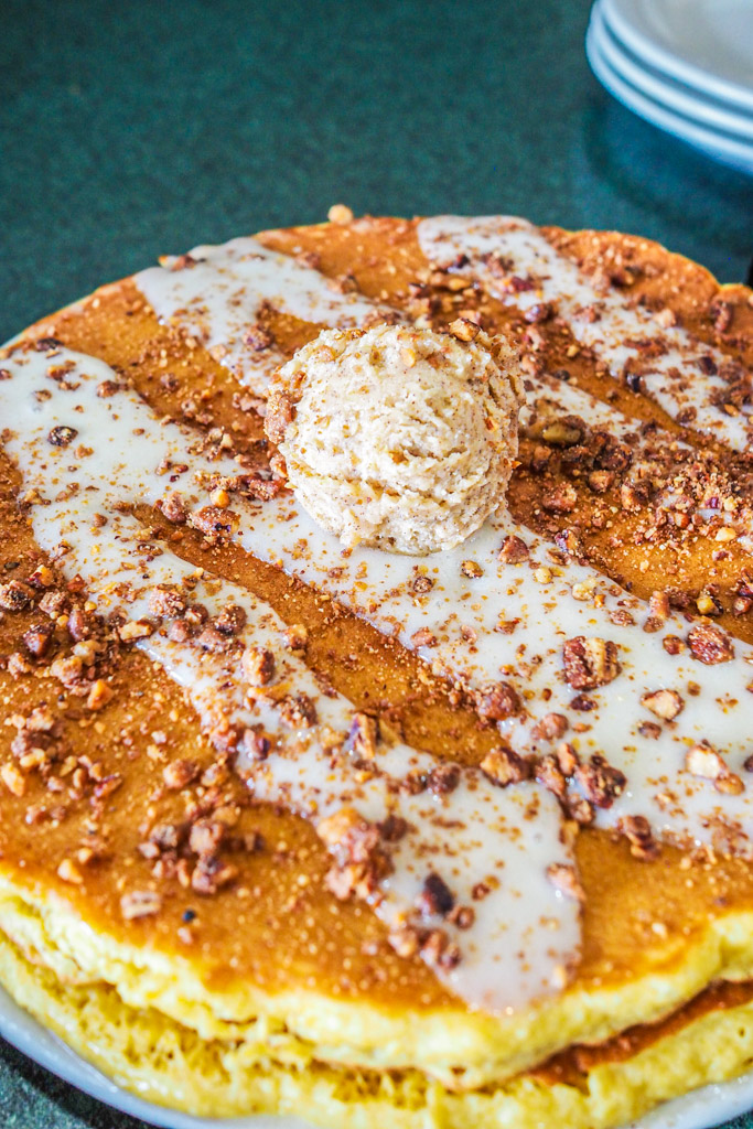 - Pumpkin Pancake – Two pancakes infused with pumpkin, topped with cream cheese icing, candied pecans, and cinnamon butter.