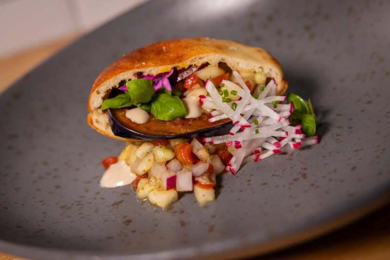 - Sabich (Amare) – Fried eggplant, Israeli salad, pickled watermelon radish, tahini garlic sauce, amba, micro parsley, and mini pita (Friday)