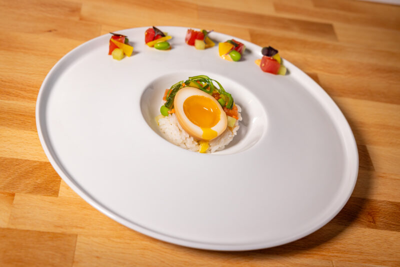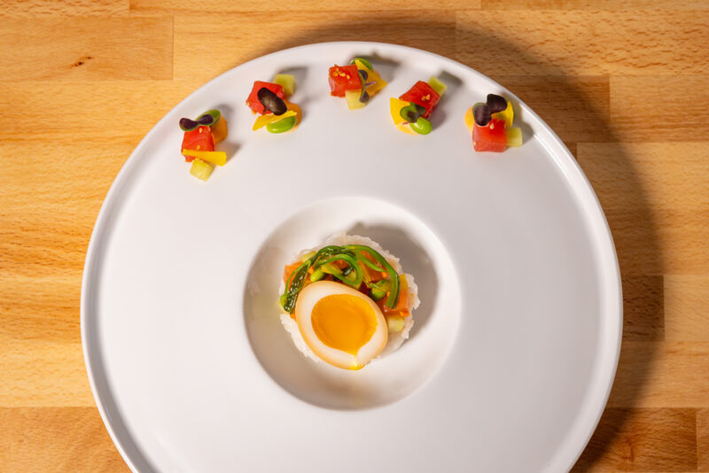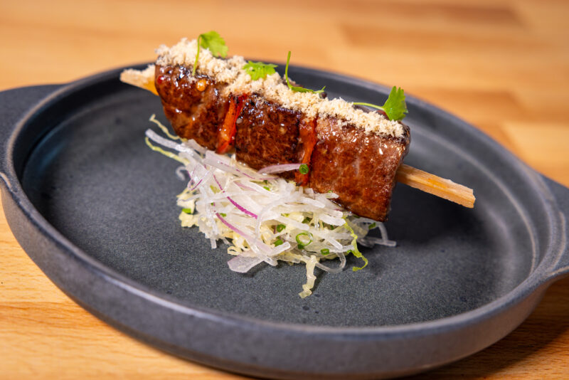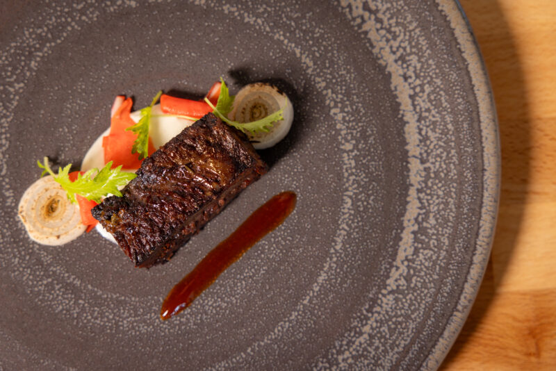 - Smoked Wagyu Beef Cheek (Smokin’ D’s BBQ) – Wagyu beef cheek with brûléed pearl onion “rings,” roasted garlic boniato foam, nearly burnt miso and ginger barbecue sauce, pomegranate pickled komachi turnip, and mizuna (Saturday)