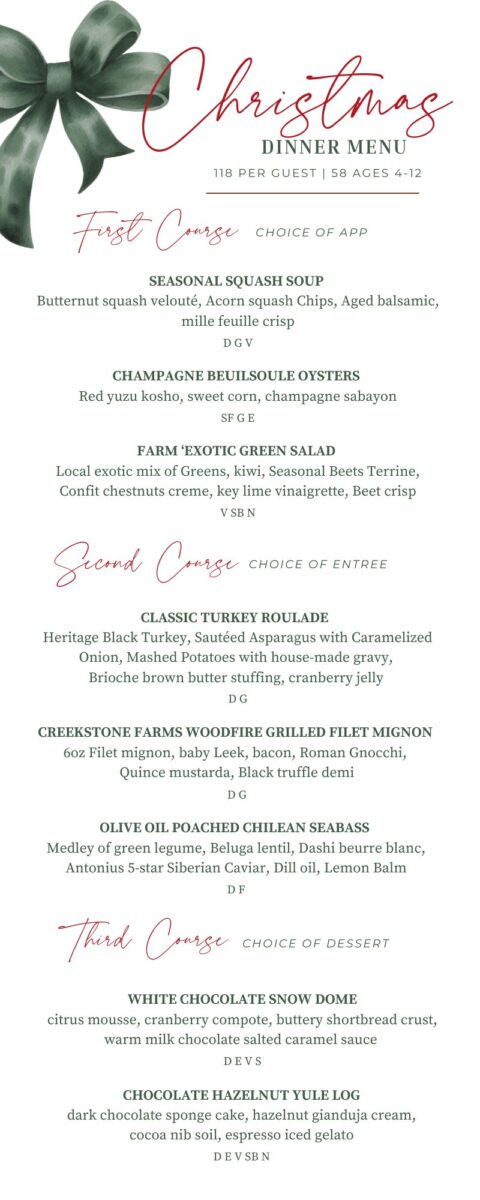 • New Year’s Eve & Day Dinner (December 31 and January 1): Crab Bisque, Beef Carpaccio, Chili-Rubbed Ribeye, Oven-Roasted Grouper