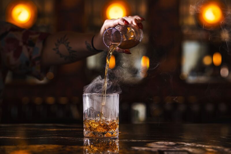 Our version of a Smoked Old Fashioned, Hell’s Half Acre, combines bourbon with a toasted rice green tea syrup, our house amaro blend, orange bitters, and a dash of champagne vinegar infused with Japanese pickled plums. The glass is smoked over a spiced wick that we make in house and the drink is poured through the smoke table side. The inclusion of amaro, a category of bittersweet liqueurs that often contain multi-generational family recipes of 30 or more herbs, roots, and spices as “seasoning” for the drink is celebrated in the cocktail’s name, which obscurely references the one stop light town that birthed Kentucky Fried Chicken.