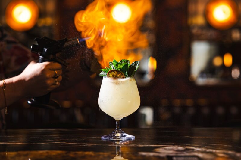 Currently, our No ICE Necessary cocktail is poured tableside on a makeshift Day of the Dead altar with flowers and torched rosemary. Our Corazon Brilliante takes the standard orange peel garnish of an Old Fashioned and carves it into a frilly, almost Bird of Paradise like organic shape for an understated flourish to wow our guests.