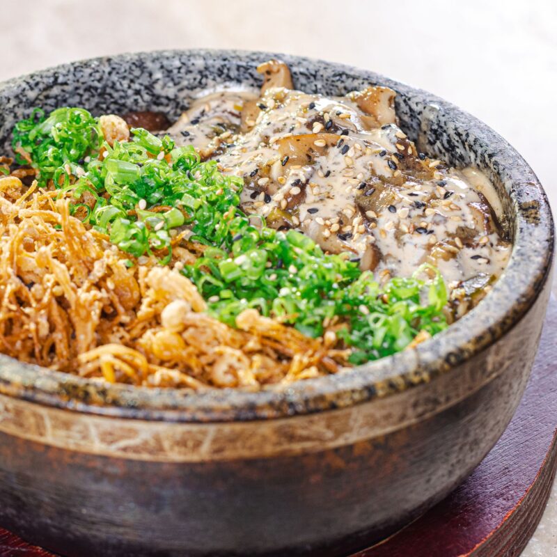 We offer a version of dolsot, where rice is served in a stone bowl. We prepare it with a sauté of shiitake mushrooms and other seasonal varieties, using as many as we can find to give the dish a simple yet comforting character, with a balanced, nourishing, and flavor-packed profile. It’s vegetarian, ideal for sharing, and designed to bring a touch of joy through simple ingredients that are carefully crafted.