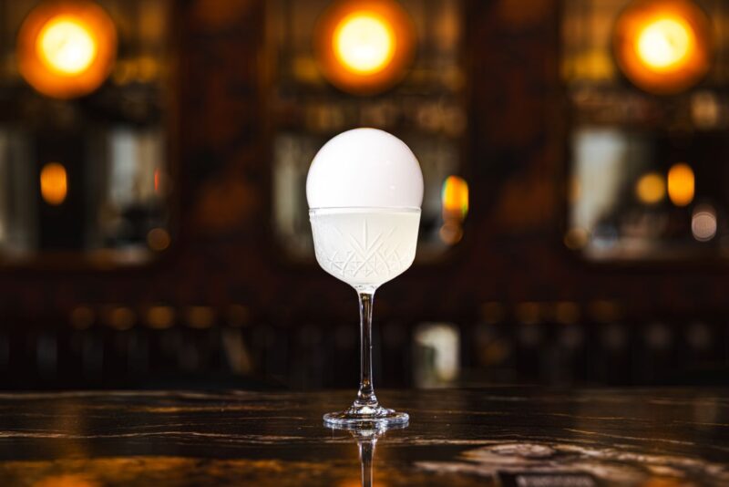 Our lychee martini, Woman in White, combines vodka, lychee liqueur, yuzu, orange blossom water, and a citrus fog filled bubble for a layered sensory experience.